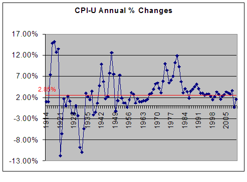 While I thought that a 2.85% CPI-U would be a pretty easy bar to cross, it’s not a slam dunk. Since 1913, the annual percent change in the CPI-U has been 3.03%. If we start in more modern times, then the average percentage increase rises to 3.82%. The graph visually shows the trend and how the 2.85% compares.